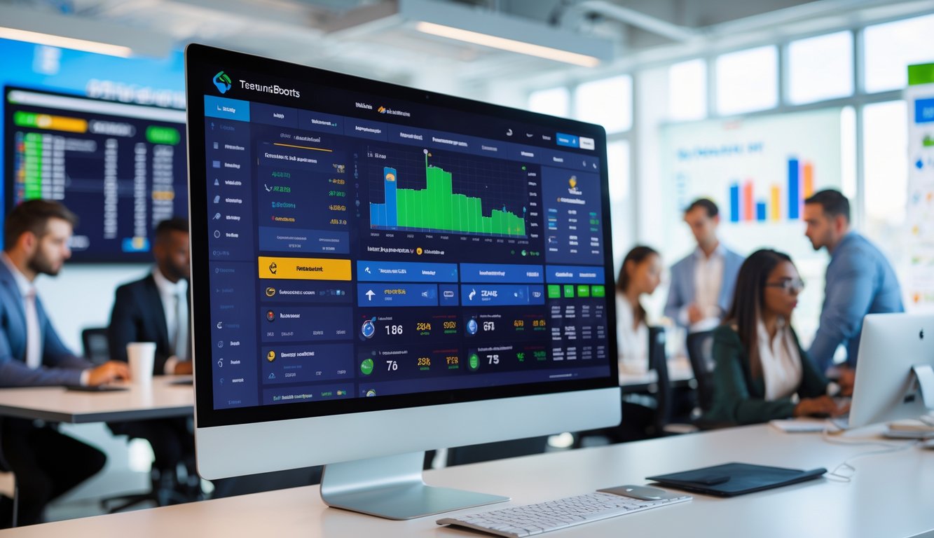 Sebuah ruangan kantor modern dengan komputer menampilkan antarmuka taruhan olahraga online dan beberapa orang sedang bekerja bersama.