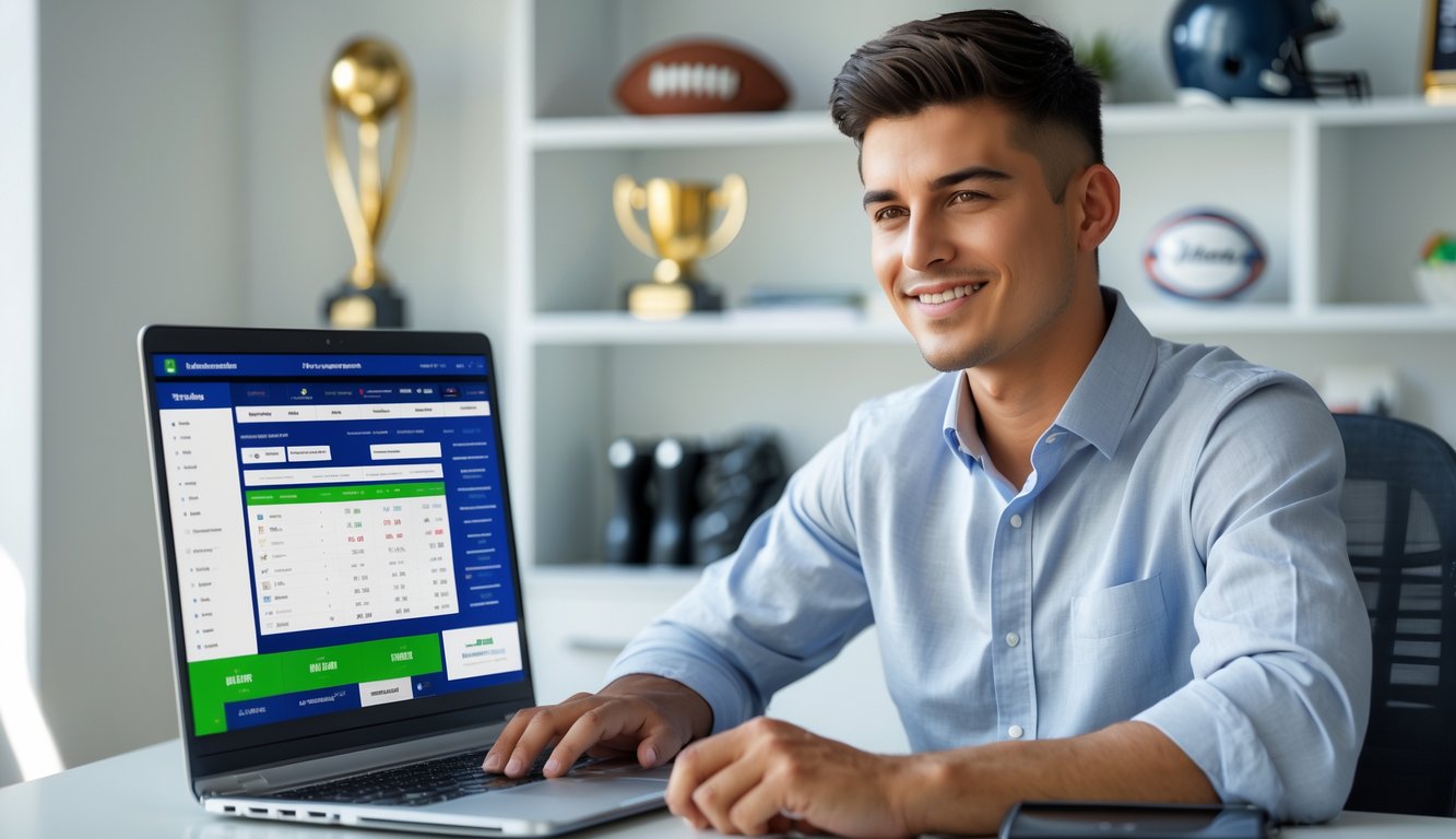 Seorang pria muda duduk di meja dengan laptop, fokus menggunakan situs taruhan olahraga online di ruang kerja yang terang dan rapi.
